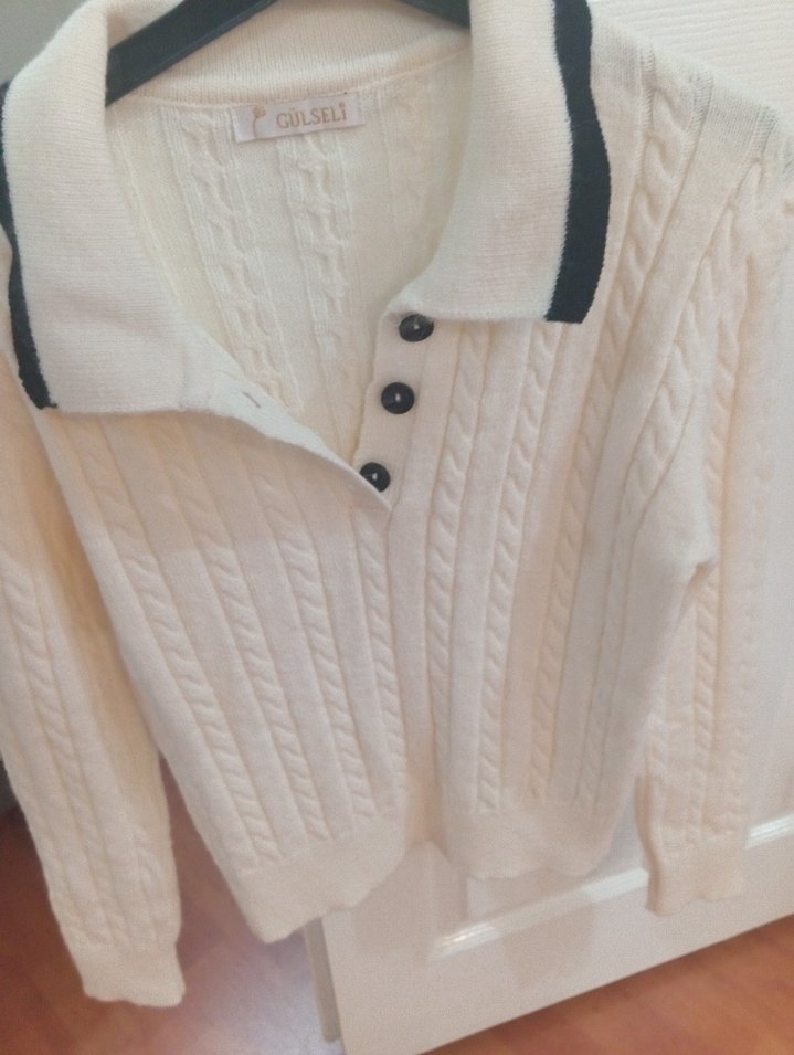Düğmeli yakalı, uzun kollu ve pamuklu kumaştan yapılmış rahat kesim gri kadın triko kazak. İnce örgü deseniyle günlük sokak stili için uygundur.