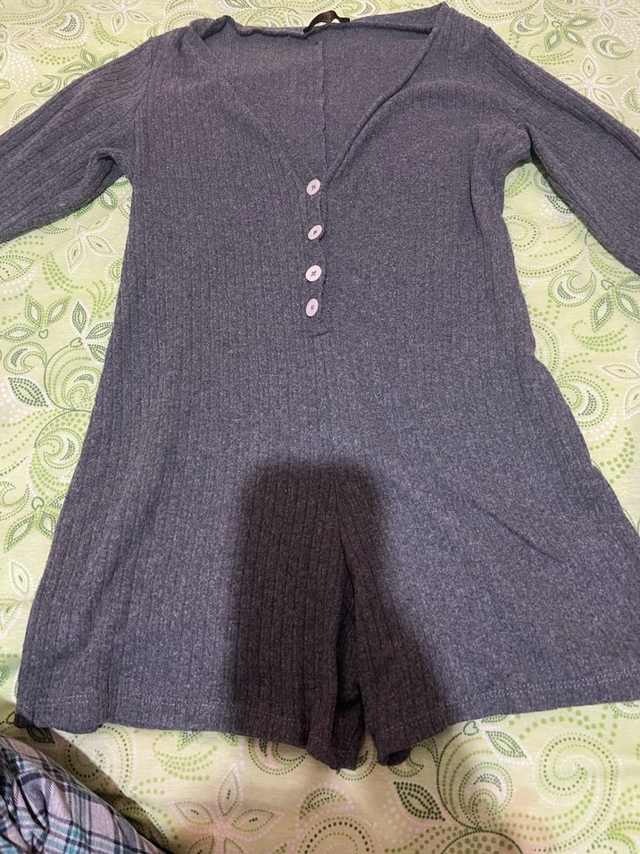 Düğmeli V yakalı, uzun kollu gri triko midi elbise, rahat bir kesime sahip.