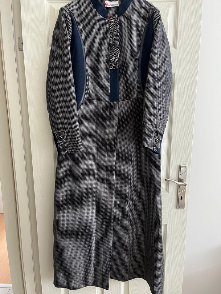 Gri renkte, düğmeli ve kruvaze yakalı uzun kadın denim kaban. Düzenli kesim, uzun kollu ve ofis kullanımı için uygundur.