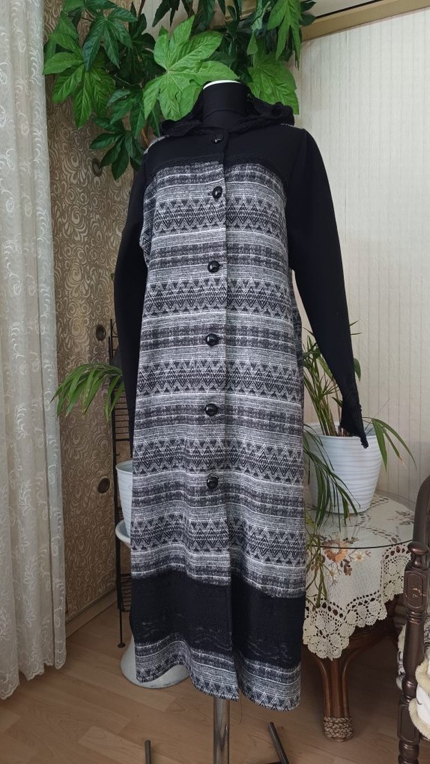 Gri tonlarda desenli, düğmeli ve uzun kollu, rahat kesim kadın kaban. Yumuşak sentetik kumaştan üretilmiş, günlük kullanım için uygundur. kapşonludur