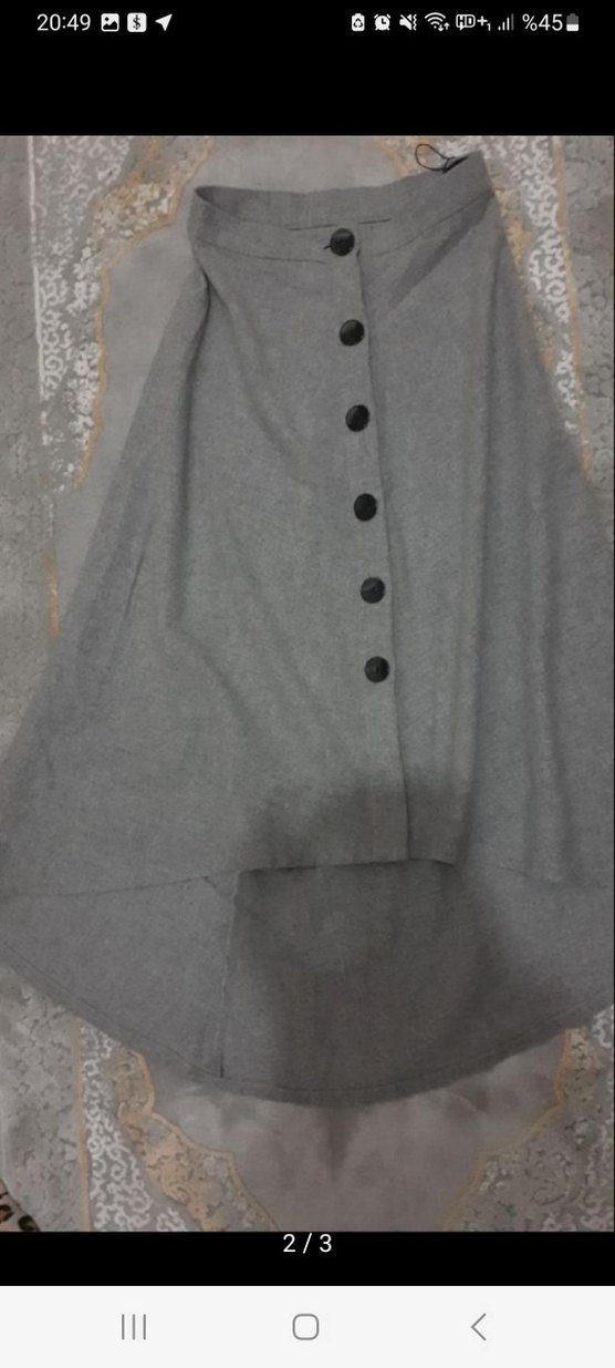 Önü düğmeli, yumuşak sentetik kumaştan, bol kesim gri uzun etek, gündelik rahat kullanıma uygun. Kumasi modeli çok güzel artık olmuyor alana hayırlı olsun