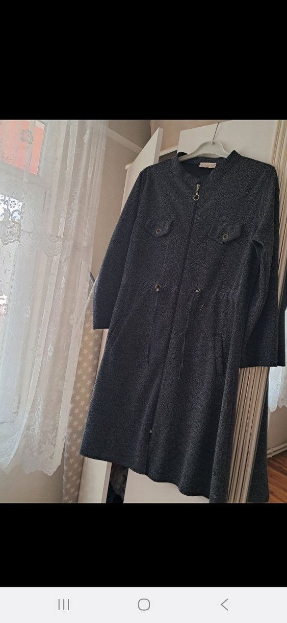 Düğmeli, gri renkli uzun kaban. Notlu yaka ve uzun kollu, rahat kesimli, desen içermeyen sentetik kumaştan yapılmıştır. Günlük kullanıma uygundur. 52 beden fakat 48.46 bedenede oldu