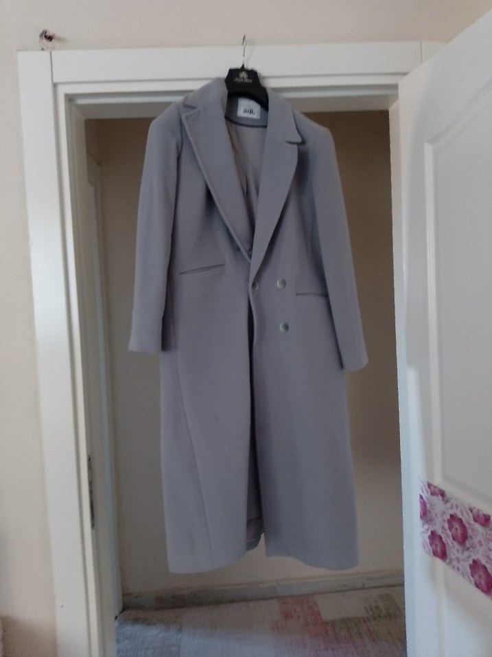 Düğmeli, gri uzun kadın kaban, klasik yakaya ve uzun kollara sahiptir. Rahat kesim ve yumuşak, sıcak kumaştan üretilmiştir, ofis için uygundur. marka bir ürün M beden
