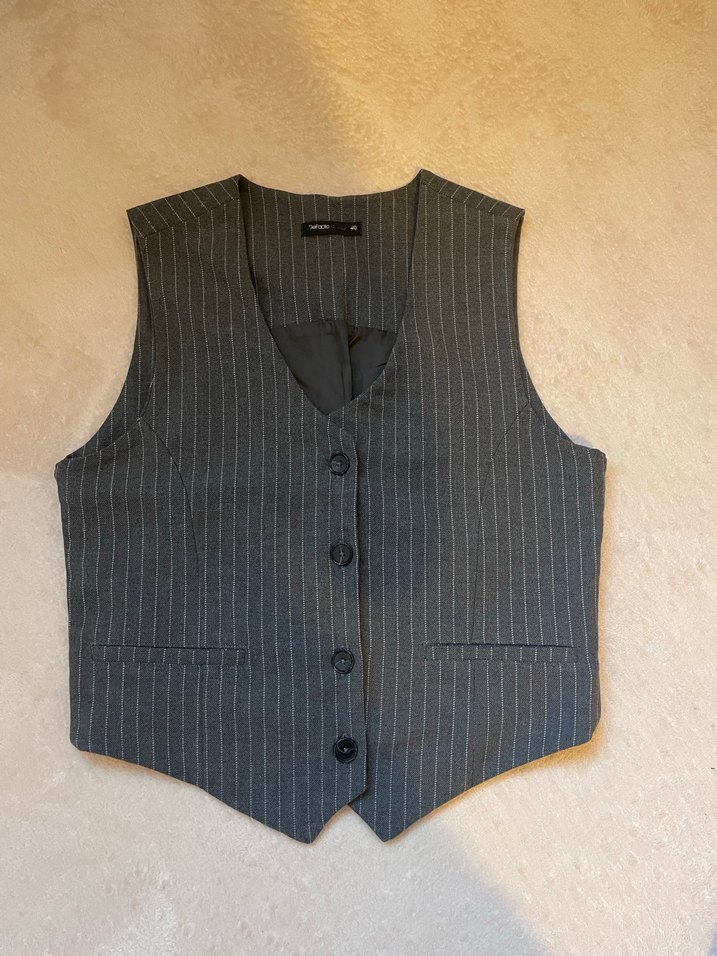 Düğmeli, yakalı ve kolsuz gri kadın yelek. Ofis için uygun, normal uzunlukta ve regular fit. Sentetik kumaştan üretilmiştir.