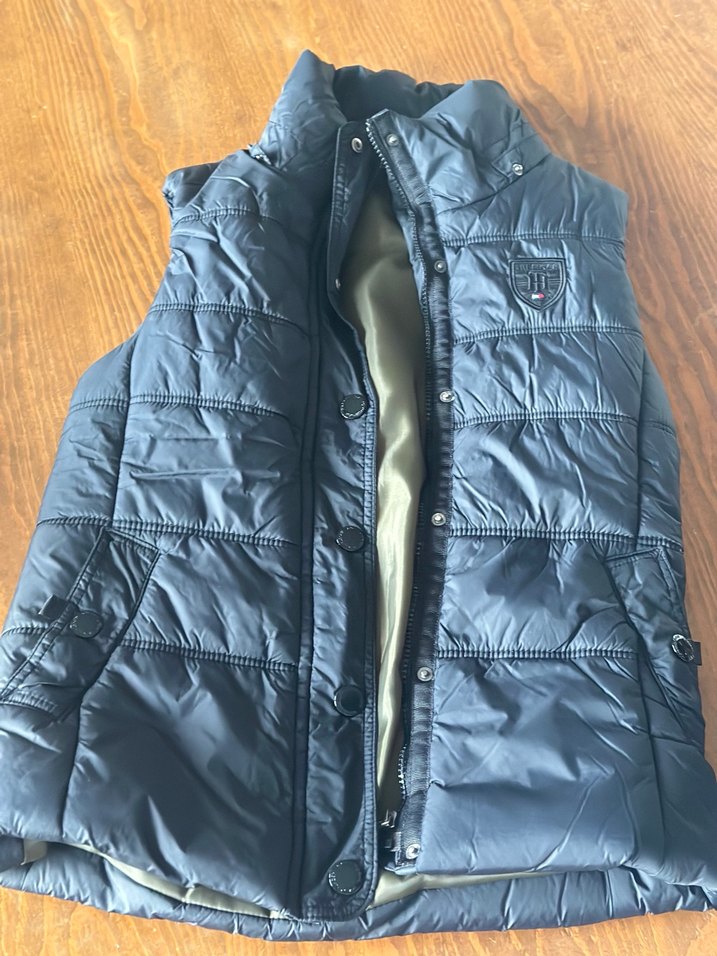 Düğmeli, gri, kolsuz erkek yeleği. Rahat kesim, normal uzunluk ve yumuşak, sıcak tutan kumaştan. Günlük sokak stiline uygun.
