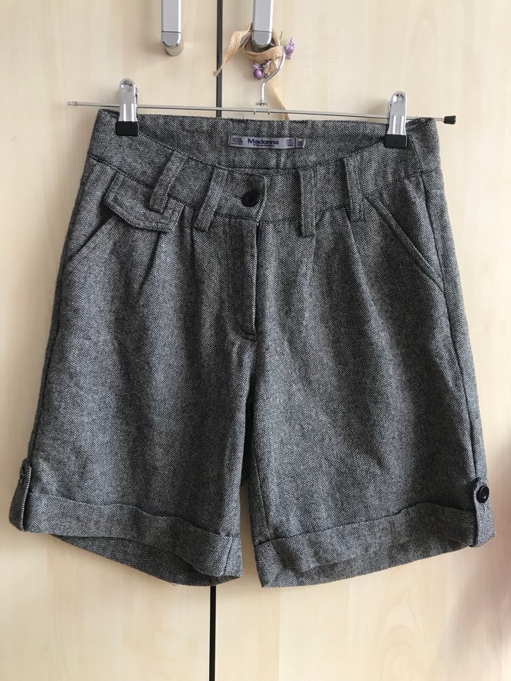 Gri renkte, düğmeli detaylara sahip yün kumaştan, rahat kesimli kısa bermuda şort. Günlük sokak modası için uygundur.