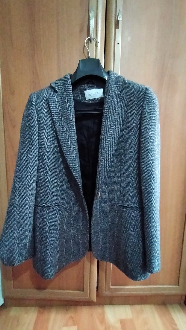 Düğmeli önü ve kesik yakasıyla gri yün ceket. Uzun kollu, normal kesim ve midi boyda, ofis için uygun klasik şıklıkta.