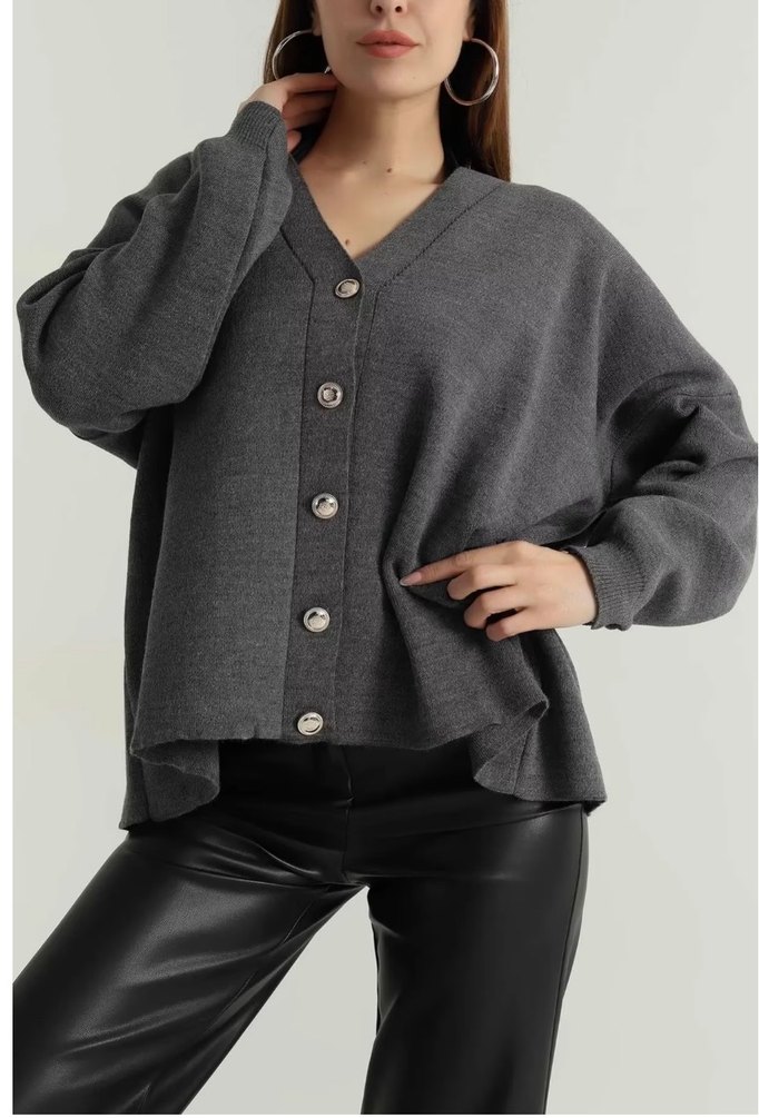 Gri yünden üretilmiş, düğmeli, V yakalı, uzun kollu ve bol kesim midi boy kadın hırka. Günlük kullanıma uygundur.