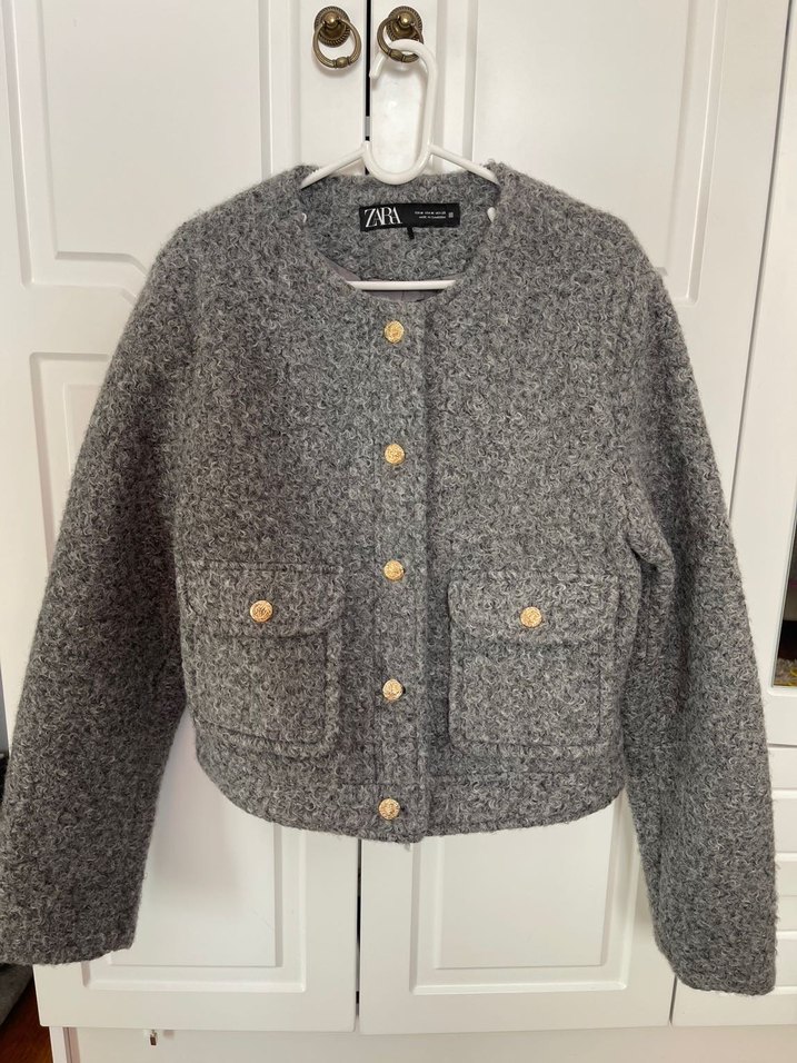 Düğmeli ön ve iki cepli gri yün kaban, uzun kollu ve normal kesimdir. Günlük kullanıma uygundur.