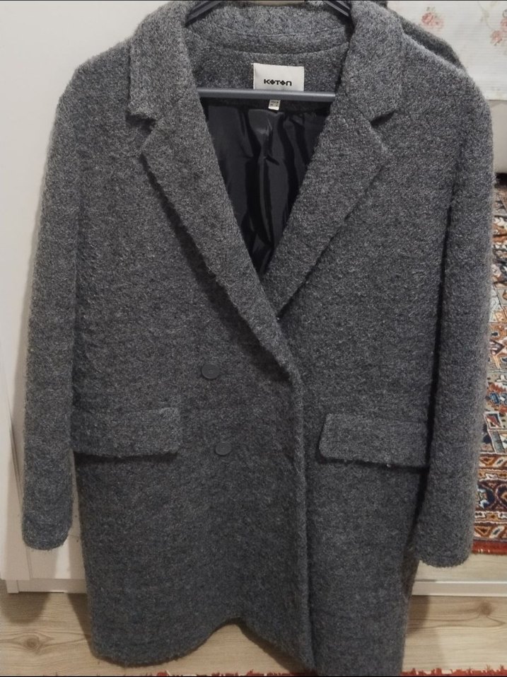 Düğmeli ön kısmı ve kesik yakasıyla yumuşak yün kumaştan yapılmış gri kadın kaban. Uzun kollu, midi boy ve rahat kesim, ofis ve günlük sokak stili için uygun. Kumaşı gereği tüylenme var temizlenir M L uyumlu