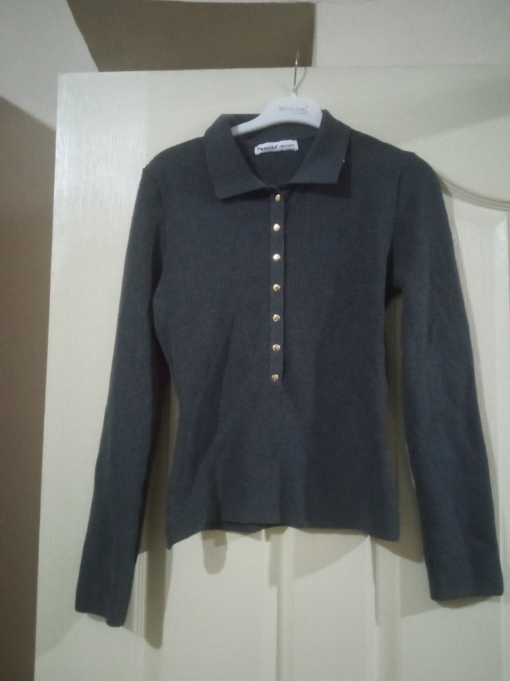 Gri yünden yapılmış, düğmeli ön ve yakalı, uzun kollu, normal kesim günlük kadın kazak.