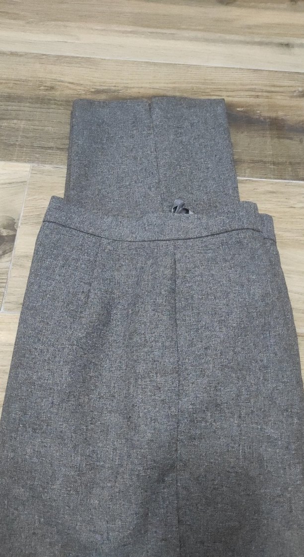 Düğmeli tasarımı ve orta boy kesimiyle gri yün kumaştan yapılmış kadın pantolonu, ofis kullanımı için uygundur. Düz ve sade bir görünüme sahiptir.
