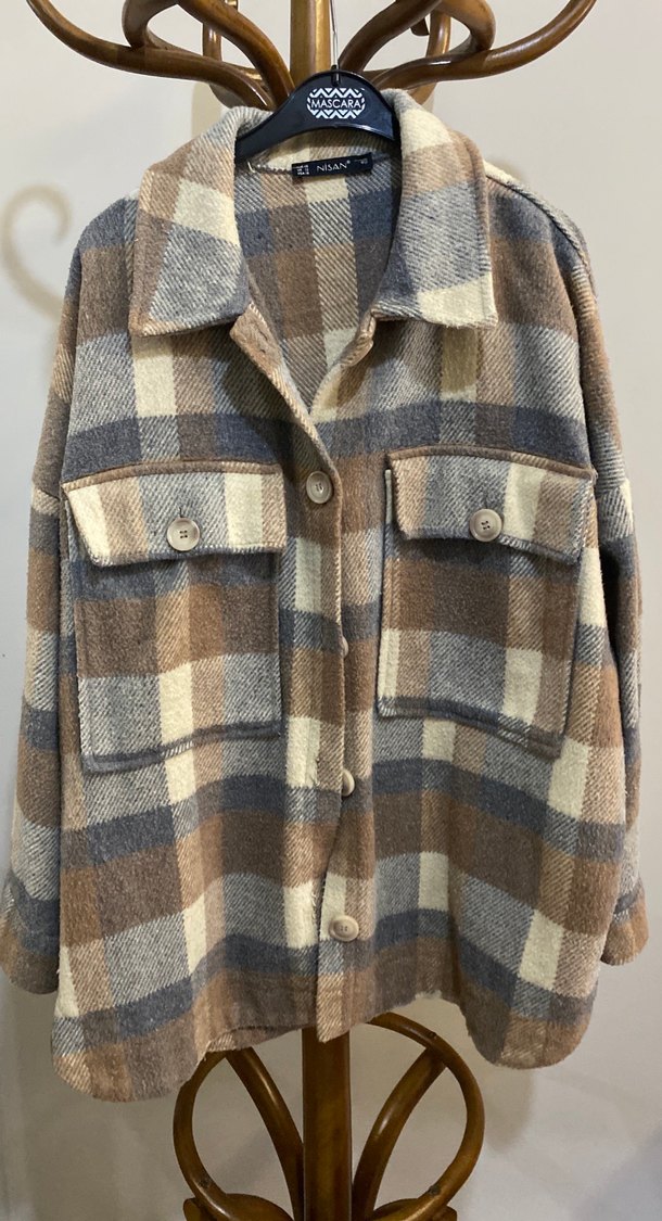 Gri ve kahverengi ekose desenli, uzun kollu ve düğmeli cep detaylı bol kesim kadın gömlek. Yumuşak ve sıcak kumaştan, rahat günlük kullanım için uygundur.