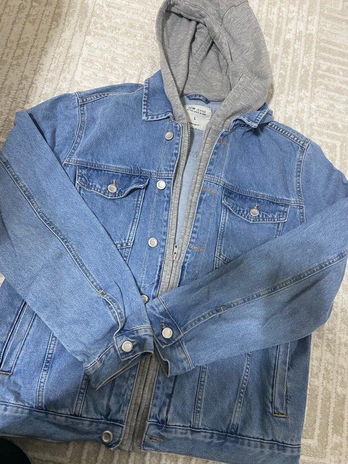 Düğmeli ve gri kapüşonlu, bol kesim denim ceket. Uzun kollu ve yakası notched lapel tarzında, günlük kullanıma uygun.