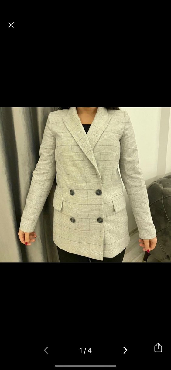 Düğmeli, gri kareli desenli kadın blazer ceket, normal boyda ve regular kesim. Uzun kollu, iş ve günlük şıklık için uygun.