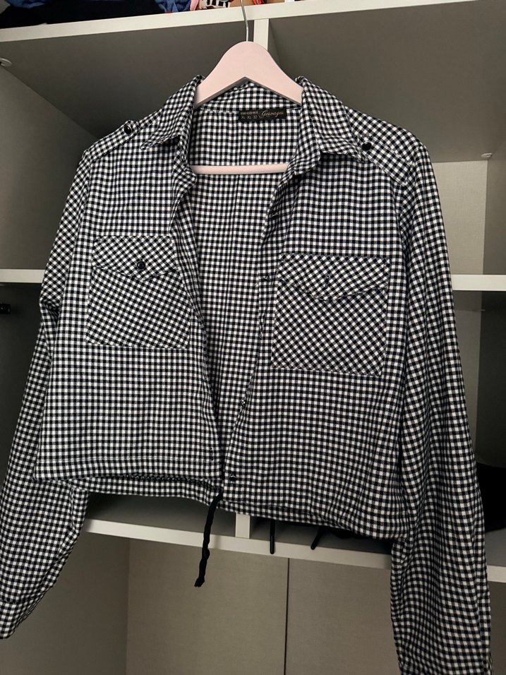 Düğmeli, gri kareli kadın gömlek, notched lapel yaka ve uzun kolludur. Pamuklu, rahat kesim, günlük sokak stili için uygundur.