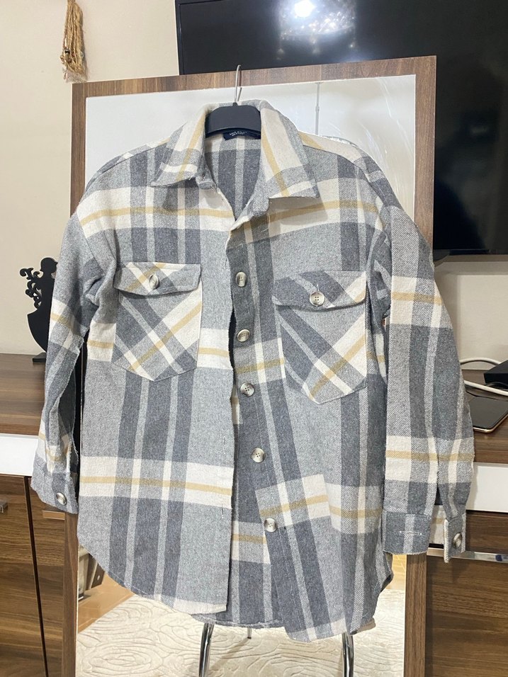 Gri kareli, uzun kollu ve düğmeli bu gömlek, rahat kesime ve yakalı tasarıma sahiptir. Yumuşak ve sıcak kumaştan üretilmiştir.