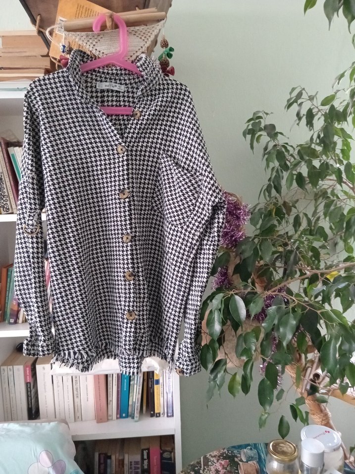 Düğmeli, uzun kollu, gri kareli desenli kadın gömleği. Bol kesimli ve yakalı, günlük kullanıma uygun bohem ve retro tarzda. Pamuklu dokuma