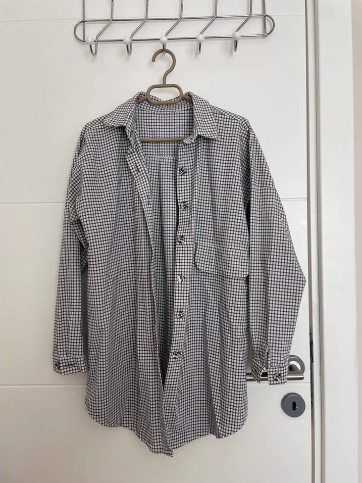 Düğmeli, uzun kollu, gri kareli, keten kumaştan üretilmiş, bol kesim midi uzunluğunda kadın gömlek. Notlu yaka detayı bulunur, günlük kullanıma uygundur.