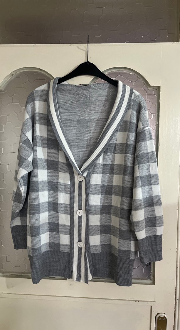 Bu rahat gri hırka, kareli desene, V yakaya ve uzun kollara sahiptir. Düğmeli ve bol kesim olup yumuşak örgü kumaştan üretilmiştir.