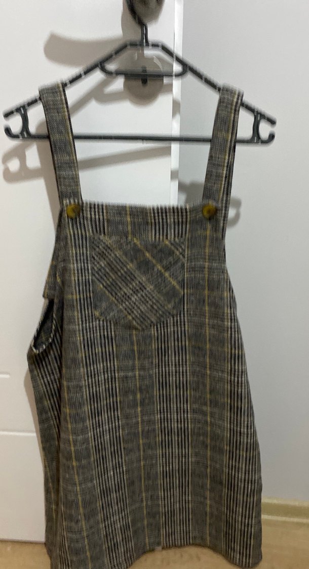 Kadın tulum, düğmeli ve askılı olup, gri kareli desene sahiptir. Rahat kesimi ve günlük kullanıma uygundur.