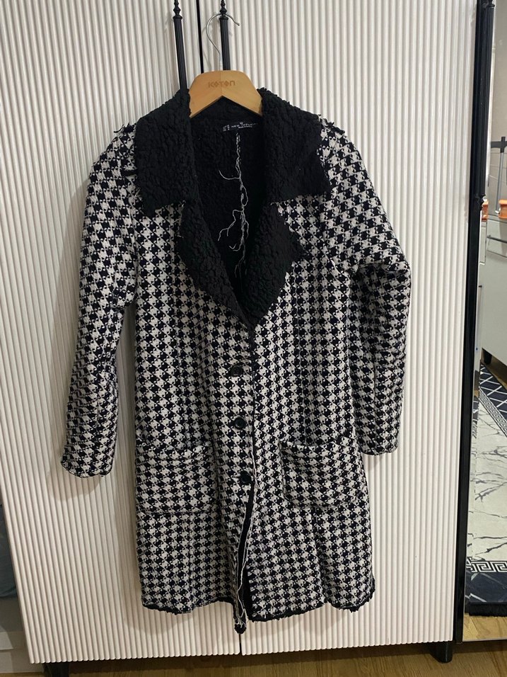 Kadınlar için kareli desenli, yün uzun kaban. Düğmeli, kesik yakalı ve uzun kolludur. Günlük sokak stiline uygundur.