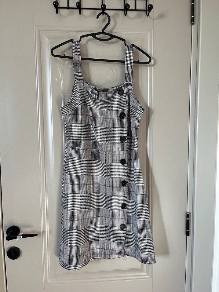 Düğmeli ön kısmı ve askılı straplez yaka detayıyla, kareli gri desenli, vücuda oturan midi elbise. Günlük ve sokak stiline uygun.