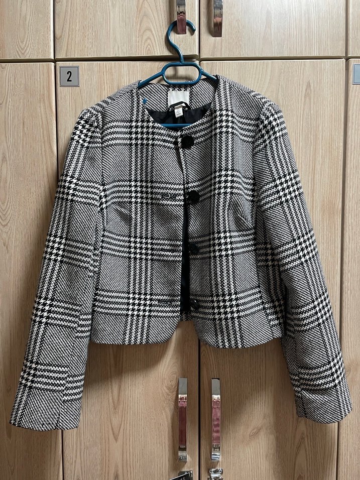 Düğmeli, gri kareli kadın ceketi, kesilmiş yaka ve uzun kolludur. Normal kesim ve midi boyda, sentetik kumaştan üretilmiştir. Ofis için uygundur.