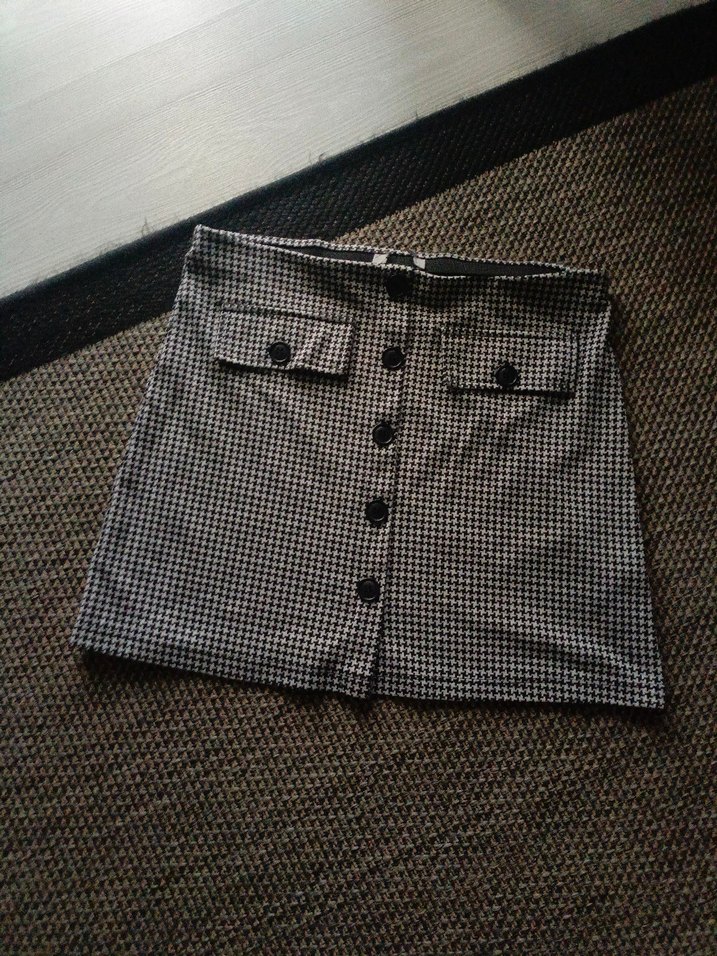 Gri kareli desene sahip, düğmeli ve ön cep detaylı, esnek pamuklu ekose kumaştan yapılmış, dar kesim mini etek. birkez giydim 40/42/44 uyumlu harika bı kalıbı var