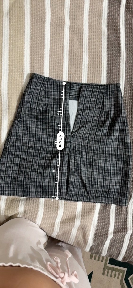 Düğmeli ön kısmı ve 41 cm uzunluğunda gri kareli, vücuda oturan mini etek. Sentetik kumaştan üretilmiş, günlük ve iş tarzı için uygun.