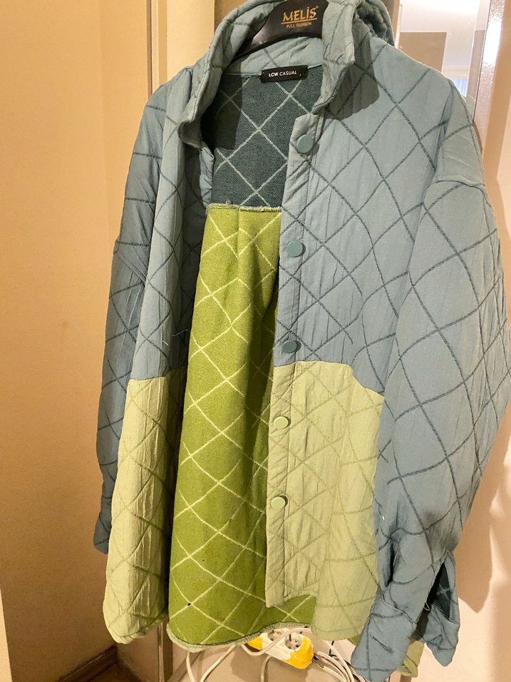 Düğmeli, keten kumaştan yapılmış bol kesim hamile ceketi. Notlu yaka, uzun kollu ve midi boyda, bohem tarzıyla günlük kullanıma uygundur. Gri renktedir.