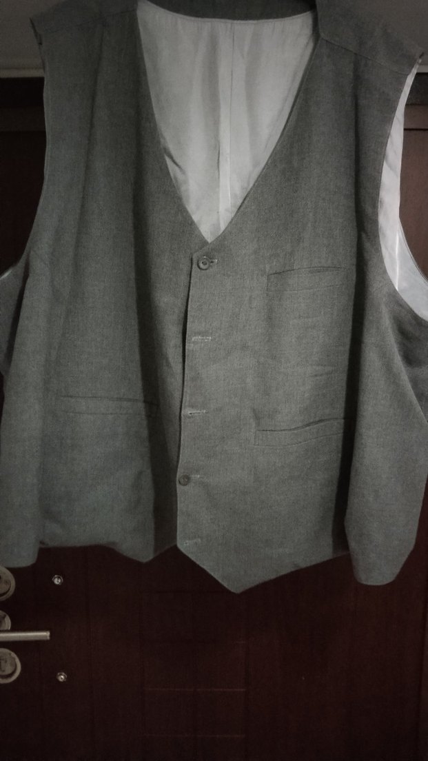 Düğmeli, gri keten kumaştan, yaka tipi kesimli, normal boy ve regular kesim erkek yelek. İş ortamları için uygundur. 56beden