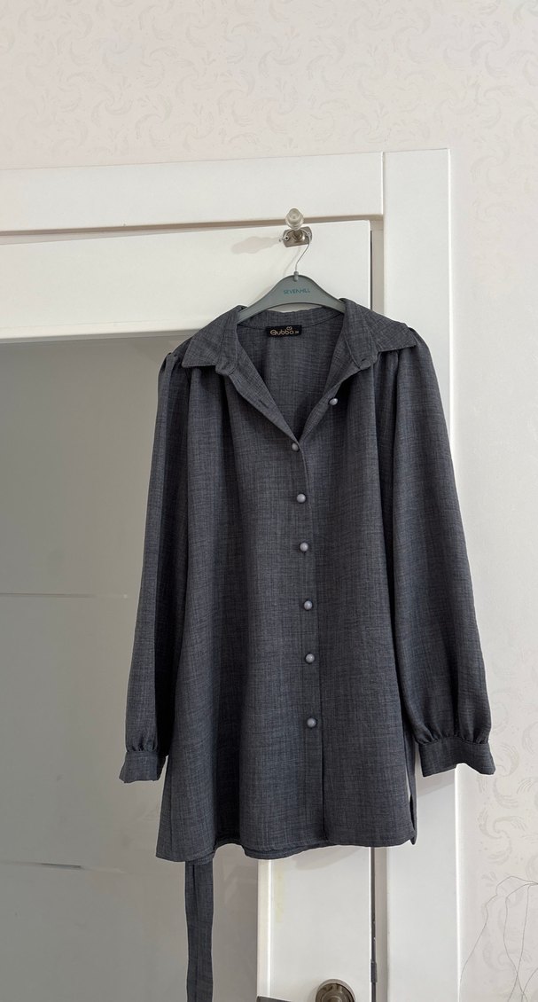 Gri keten kumaştan yapılmış, düğmeli, uzun kollu, normal kesim ve midi boy bluz. Ofis kullanımına uygundur.