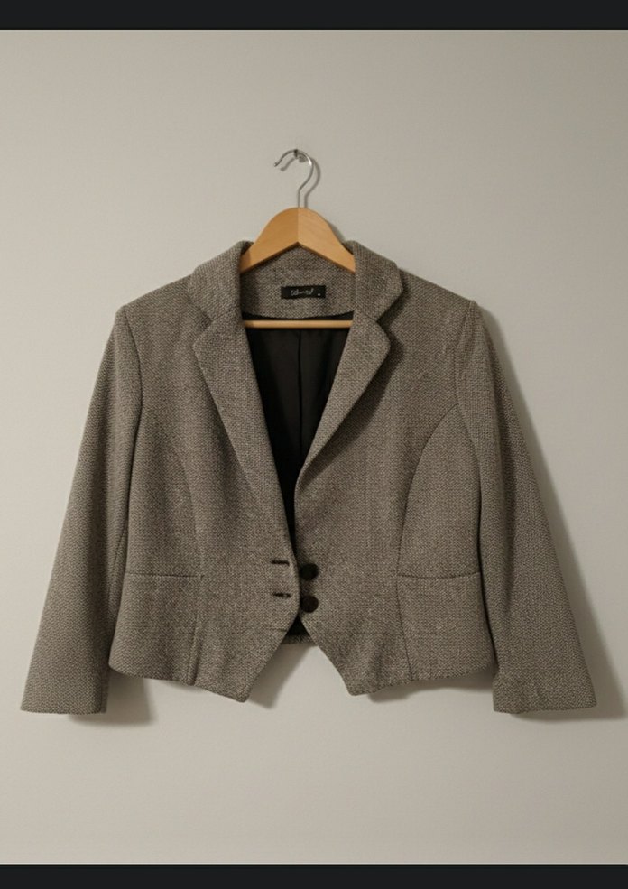 Gri keten kumaştan, düğmeli, kesik yakalı ve uzun kollu, normal boyda klasik kesim kadın blazer. Ofis için uygundur.