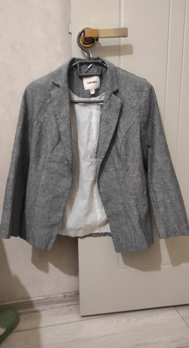 Düğmeli, keten kumaştan gri kadın blazer ceket, normal uzunlukta ve regular fit kesimlidir, ofis için uygundur cok iyi durumda