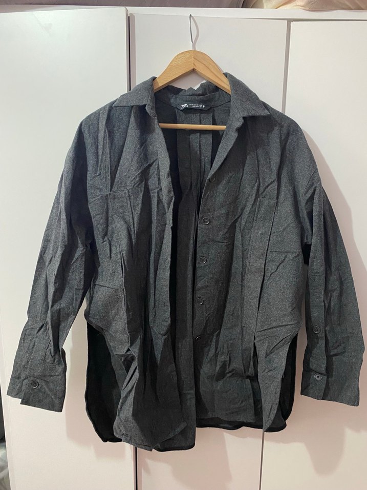 Gri keten kumaştan, düğmeli, uzun kollu, normal boy midi kadın gömleği. Notched lapel yakaya sahip, rahat kesim, ofis için uygun. Oversize oldugu icin XS-M ye kadar giyilir rahatlikla. Bir kere giyildi.