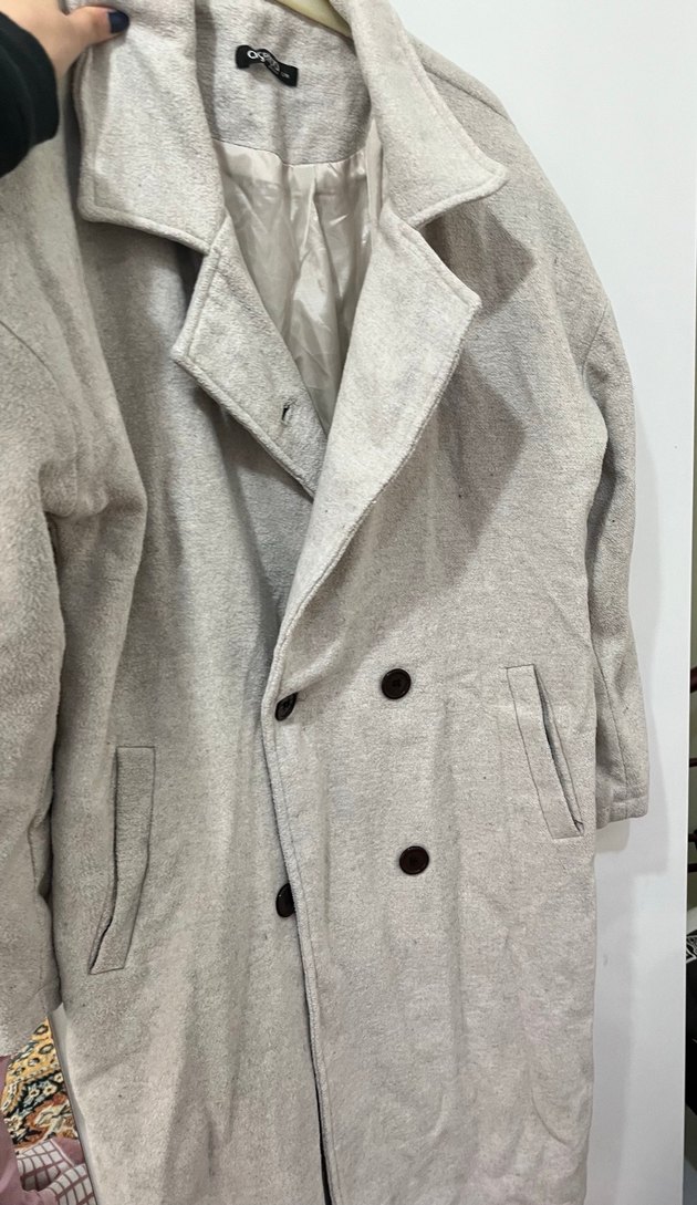 Gri-ekru kadın keten kaban. S-M uyumlu. Hiç giyilmedi. Astarlı
