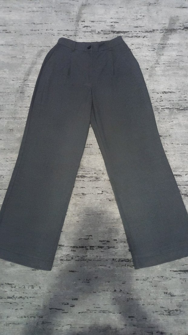Kadın kumaş pantolon, gri. Etikette XXL yazıyor ama bel ölçüsü 79 cm.
