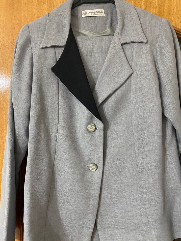 Düğmeli, keten kumaştan uzun boy gri kadın takım elbisesi. Klasik yaka, uzun kollu ve modern klasik tarzda, ofis için uygun.