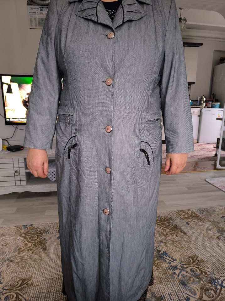 Düğmeli, keten kumaştan yapılmış uzun gri kadın kaban. Notch yaka ve uzun kollu, Sadece birer kere giyilmistir 54 beden