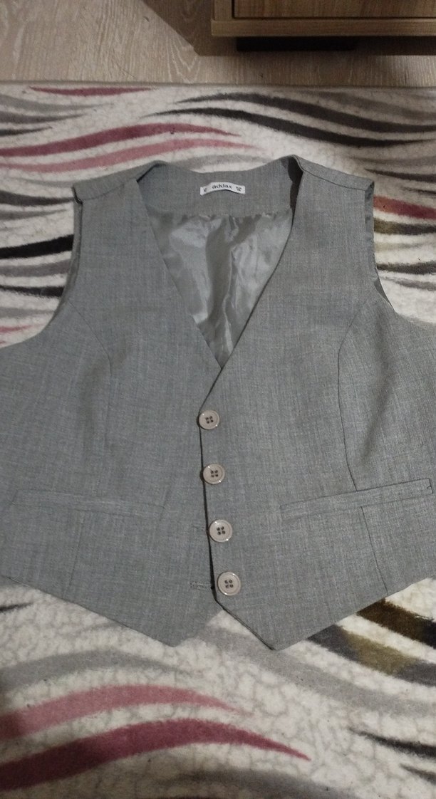 Düğmeli, keten kumaştan gri, kolsuz yelek. Normal boy ve regular fit kesim, ofis ve günlük tarz için uygun.