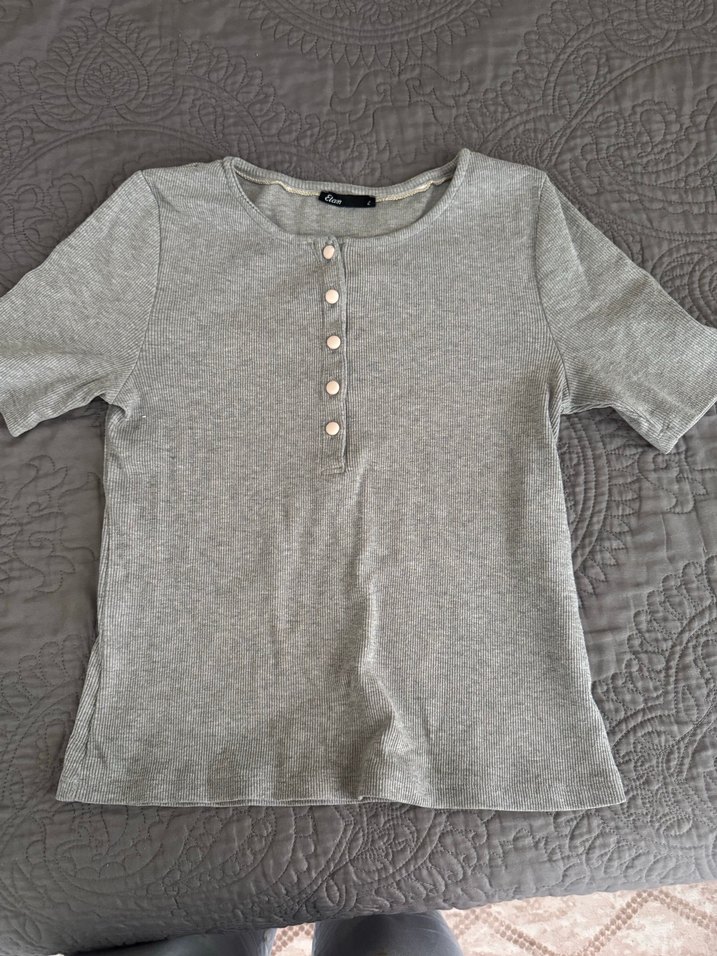 Düğmeli ön kısmı, kısa kollu ve bisiklet yaka tasarıma sahip gri keten, günlük kullanıma uygun kadın tişörtü. Defosu yoktur esnek bi kumaşı vardır çok rahat