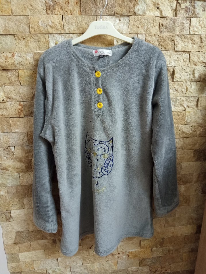 Gri renkte, düğmeli, uzun kollu ve yuvarlak yaka eşofman üstü . Rahat kesimi ve canlı sarı düğmeleriyle dış mekan kullanımı için uygundur.üründe bir kaç yerinde dikiş izi var ama yünlü olduğu için hiç gözükmüyor