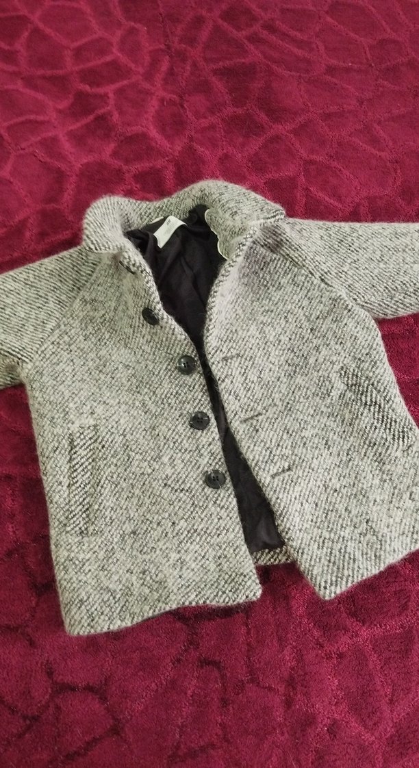 Gri renkte, düğmeli kısa kaban. Yumuşak ve dokulu kumaştan üretilmiş, dik yaka ve yan ceplidir.