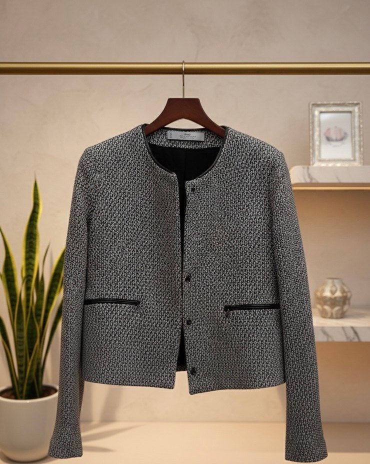Kadınlar için düğmeli, uzun kollu gri kısa ceket. Sentetik kumaştan, ofis için uygun, çağdaş ve rahat kesim.