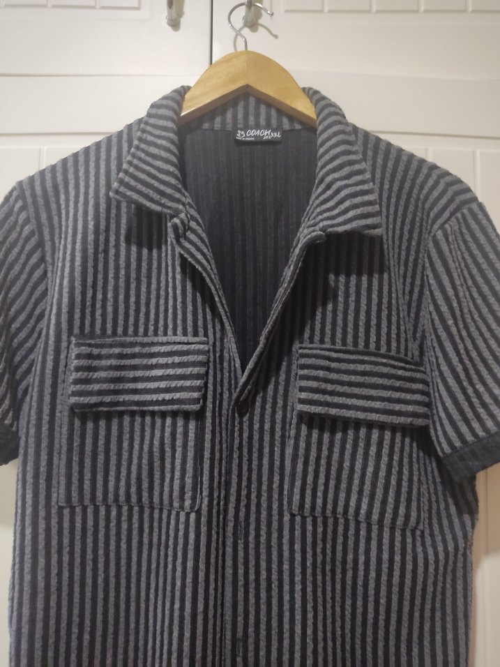 Bu erkek gömlek, düğmeli kapama, kısa kollu ve normal boyda olup, yumuşak yün kumaştan yapılmıştır. Gri çizgili deseni ve rahat kesimiyle günlük kullanıma uygundur. kisa kol gomlekte sikim.hatasi vardir. ikisinin fiyatidir