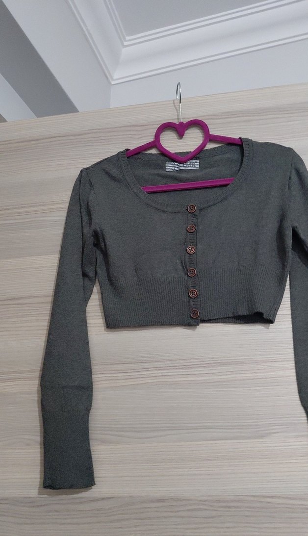Düğmeli, uzun kollu, yuvarlak yakalı, gri renkli, ince örme kumaştan yapılmış kız bolero. Sade ve rahat bir görünüm sunar.