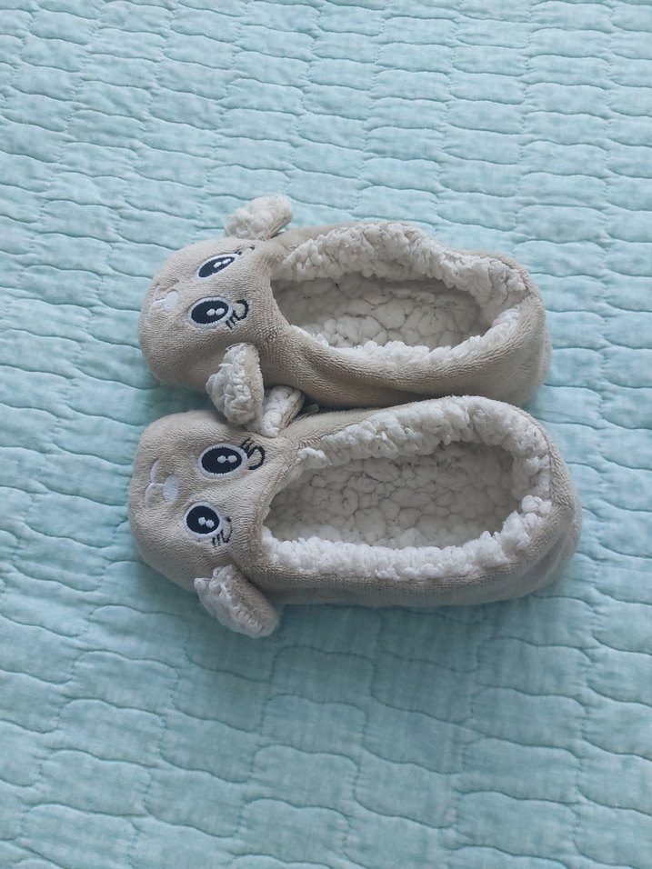 Gri renkli, düğmeli kız çocuk terliği, yumuşak ve sıcak kumaştan üretilmiş, sade ve normcore tarzında.