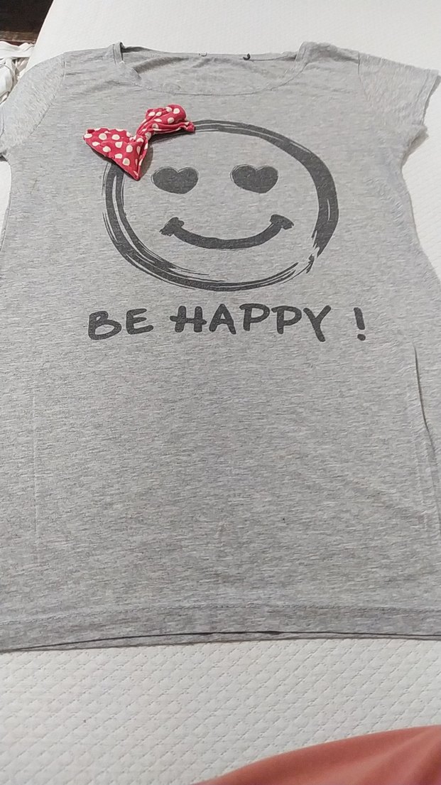 Pamuk gri kız çocuk tişörtü, kısa kollu ve yuvarlak yakalıdır. Bol kesim, üzerinde 'BE HAPPY!' yazılı gülen yüz baskısı, pembe puantiyeli fiyonk ve düğme detayına sahiptir.