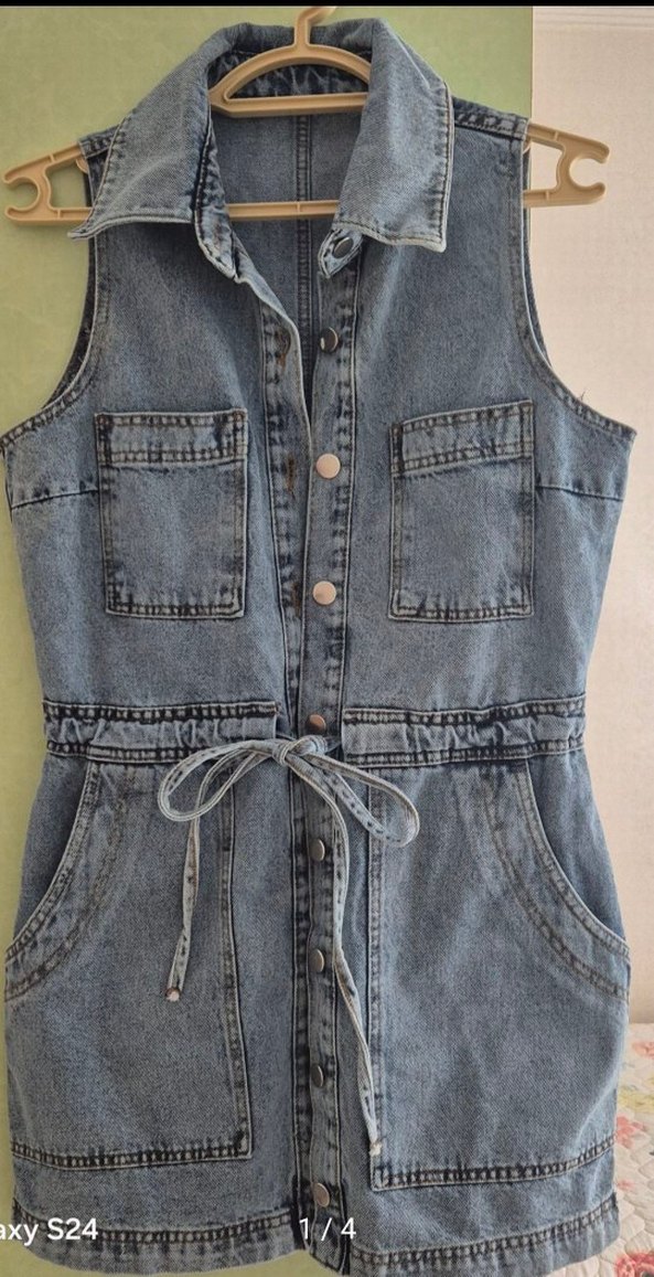 Gri kolsuz denim ceket, düğmeli, yakalı ve fitted kesimlidir. Önde cepler ve belde ayarlanabilir bağcık bulunur. Günlük sokak tarzına uygundur.